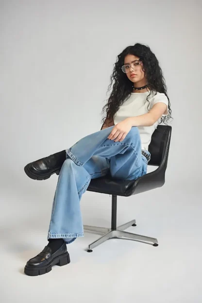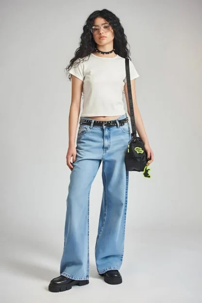 Jean 5 bolsillos tiro largo relajado, con pierna amplia en lona extra liviana.