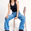 Jean 5 bolsillos calce relax (tiro medio relajado piernas rectas) en lona 100% algodón, lavado celeste oscuro con roturas y detalles gastados.